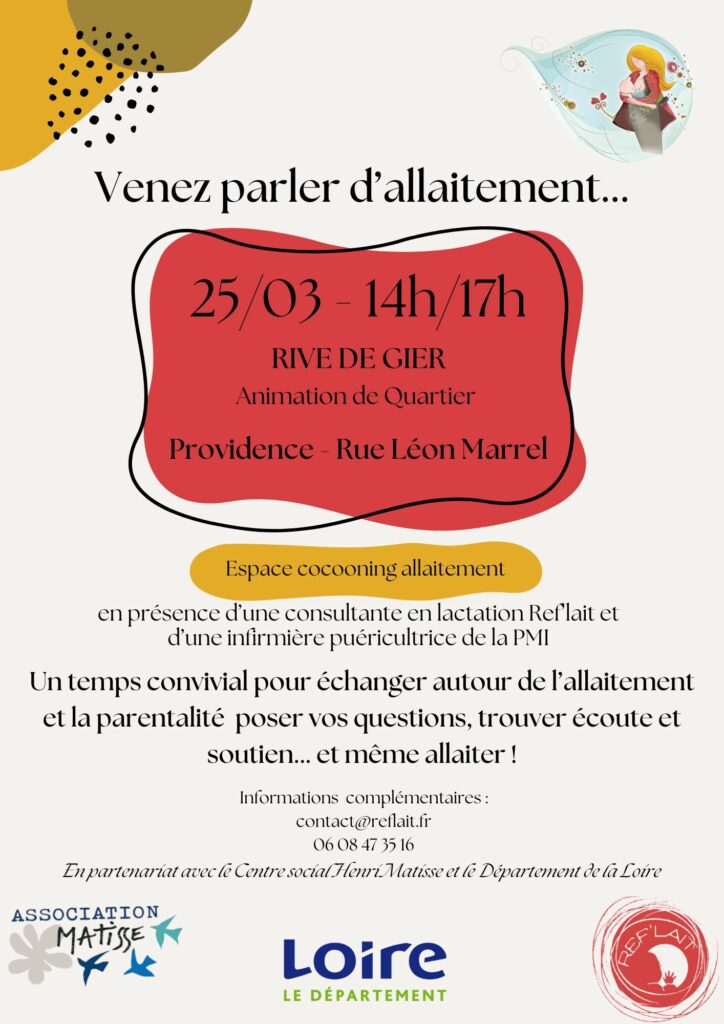 Dans le cadre de la fête de quartier du Centre social Henri Matisse à Rive de Gier, nous vous proposons un temps convivial autour de l’allaitement et de la parentalité en partenariat avec le Département de la Loire 🤱