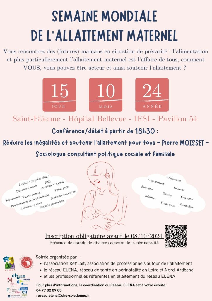 - Co-organisation avec le réseau ELENA d’une soirée conférence débat ouverte aux parents et futurs parents 15/10 sur le thème « Réduire les inégalités et soutenir l’allaitement pour tous » avec l’intervention du sociologue Pierre Moisset à Saint-Etienne-Hôpital Bellevue.